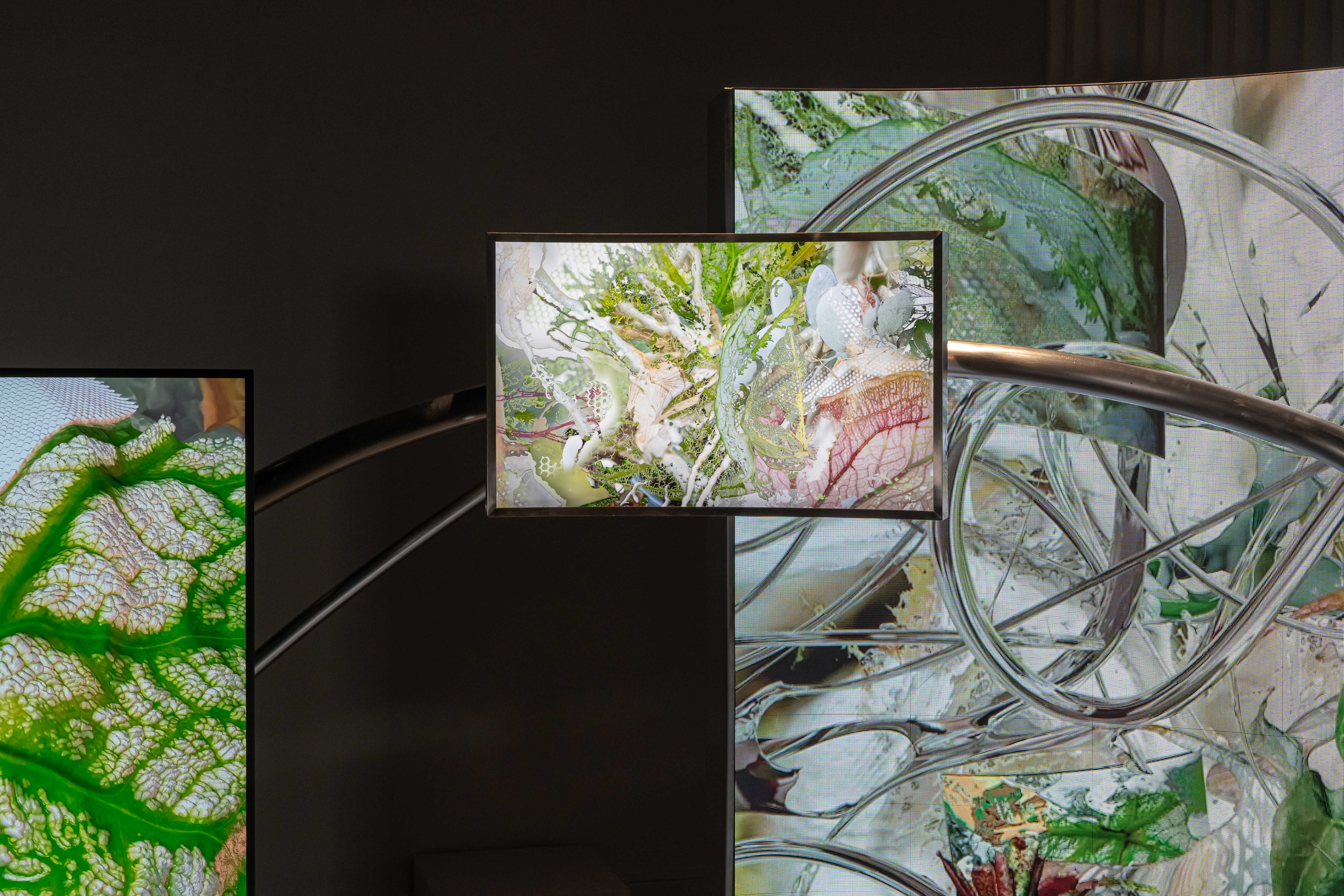 Gijeong Goo, who has been embodying nature within the features and experiences of digital devices, raises questions in his latest work about how urban dwellers can remain useful to nature and sustain an attitude inspired by it, even in a state of isolation from nature. He also explores whether it is possible to transcend anthropocentrism without physically moving the body. The work was inspired and initiated by the nature-friendly design studio of the artist's friend. By designing the growth and combination of various plants placed by the window of a small office in an urban building, he was collecting and nurturing plants with strange patterns or unique colors, arranging them within the space, through the relationship between urban plant keepers (humans) and companion plants (non-humans). The artist photographed and 3D scaned the companion plants, collecting high-resolution data to create images. The images of TV and structures are then framed within actual screens, juxtaposing real and virtual imagery to induce a meditative immersion in the viewer. Through this, the artist questions the gap between experiencing meditative nature and the cycle of utilizing what is given in urban environments, such as digital devices and human technological design. He aims to deconstruct and reconstruct digital nature in the most urban manner.